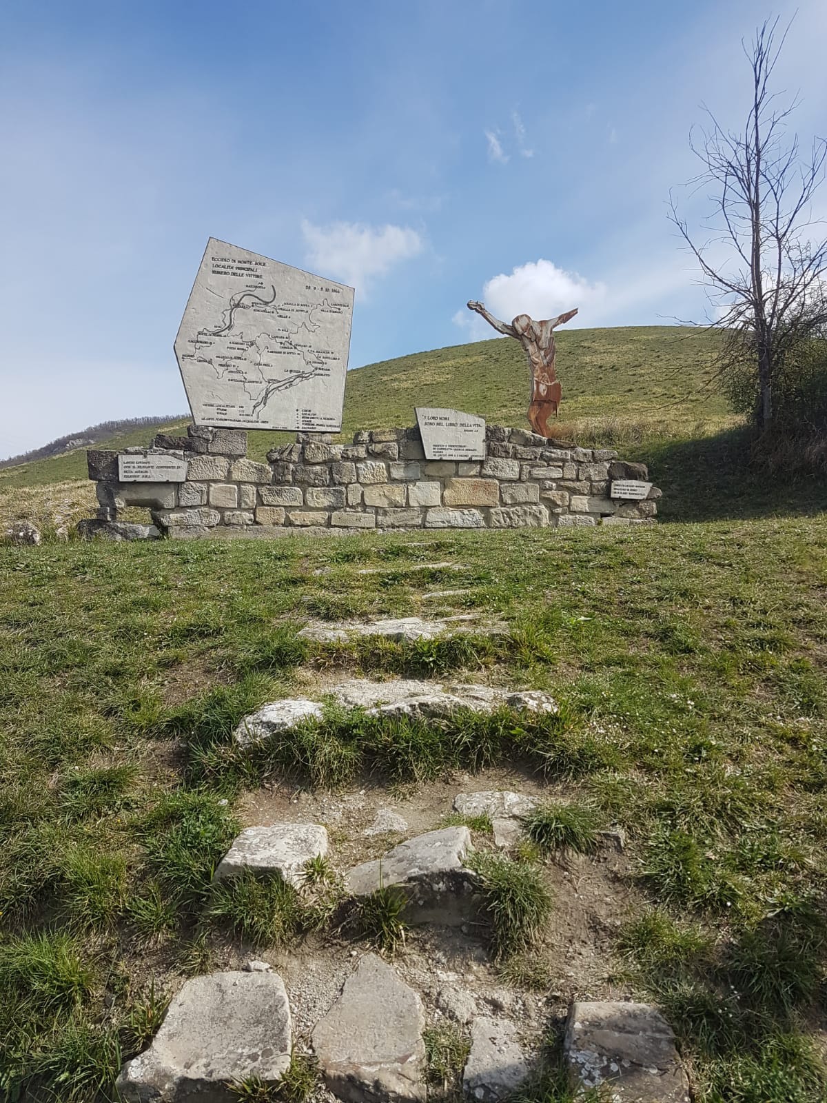 Sulla grande piastra è riprodotta una piantina della zona di Monte Sole con le località dove i nazisti operarono le stragi e il numero delle vittime. il Cristo è opera dello scultore Luciano Nenzioni. Scatto realizzato da Chiara di Paola.